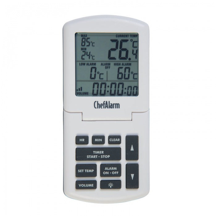 The ChefAlarm is a professional cooking thermometer and countdown/up timer which displays the countdown/up time, current temperature and simultaneously displays both the high/low alarms and max/min temperatures.