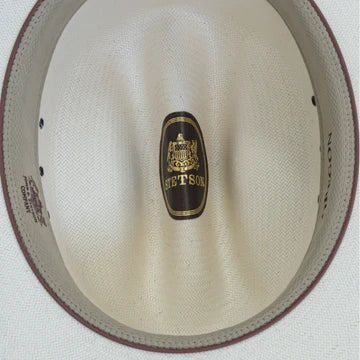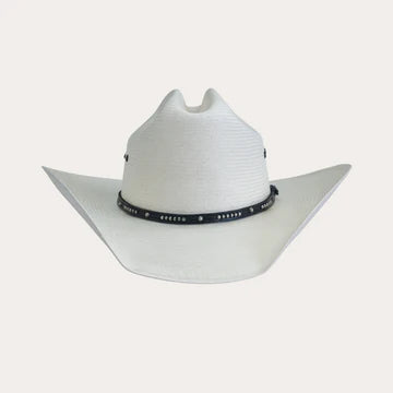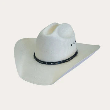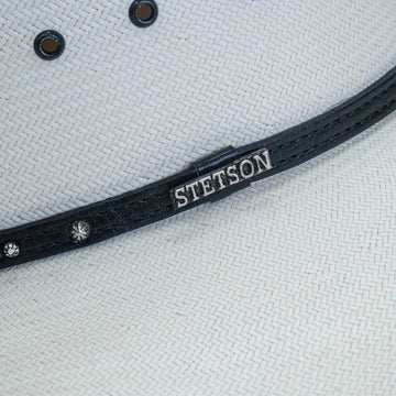 The Stetson Oregon Western straw hat. Handcrafted using quality 10X genuine straw. Styled with a firm 10.8cm shaped brim, 10.47cm cattleman crown. Finished with an interior dri-lex sweatband and leather hat band with silver stud accents.