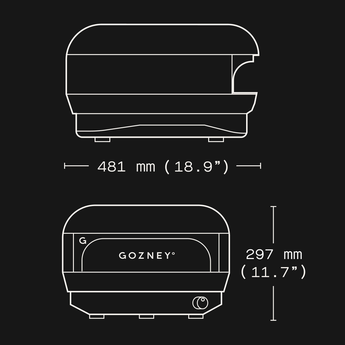External dimensions: W 430mm (16.9”) x D 481mm (18.9”) x H 297mm (11.7”)