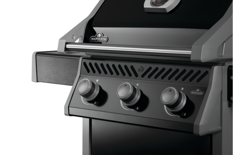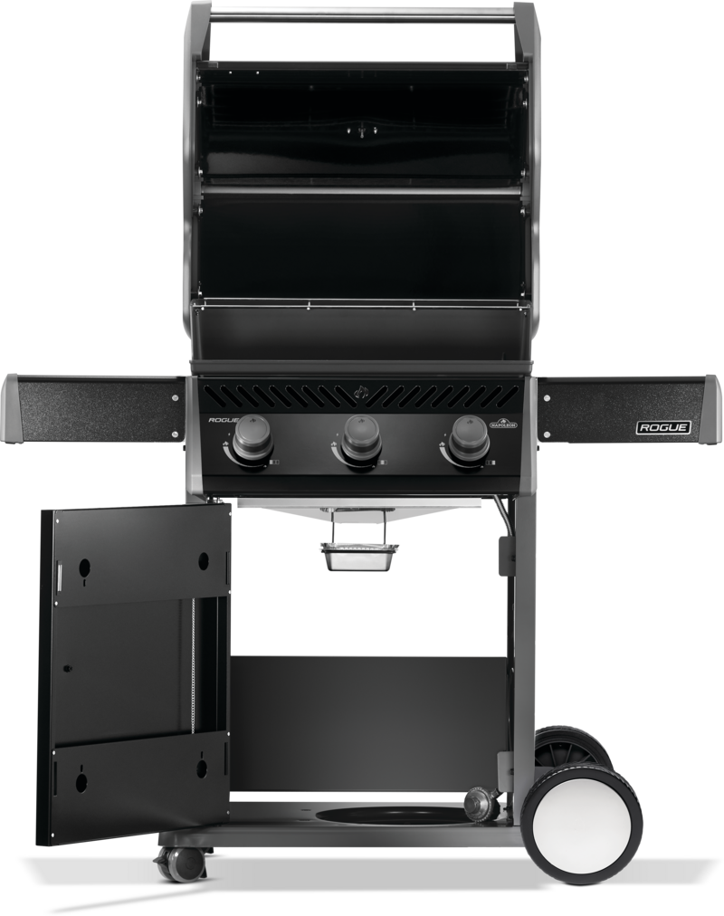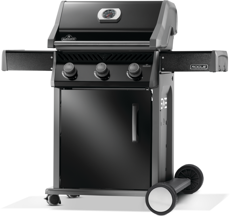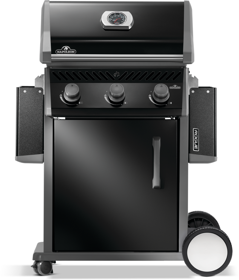 Napoleon’s Rogue® 425 Propane Gas Grill in black, is a premium quality gas grill with an affordable price. Three burners light every time with a battery-free ignition. This grill boasts precise temperature control, high heat searing over cast iron cooking grids and stainless steel sear plates for even heating and to keep your grill clean. The stylish black exterior is highly durable and easy to clean.
